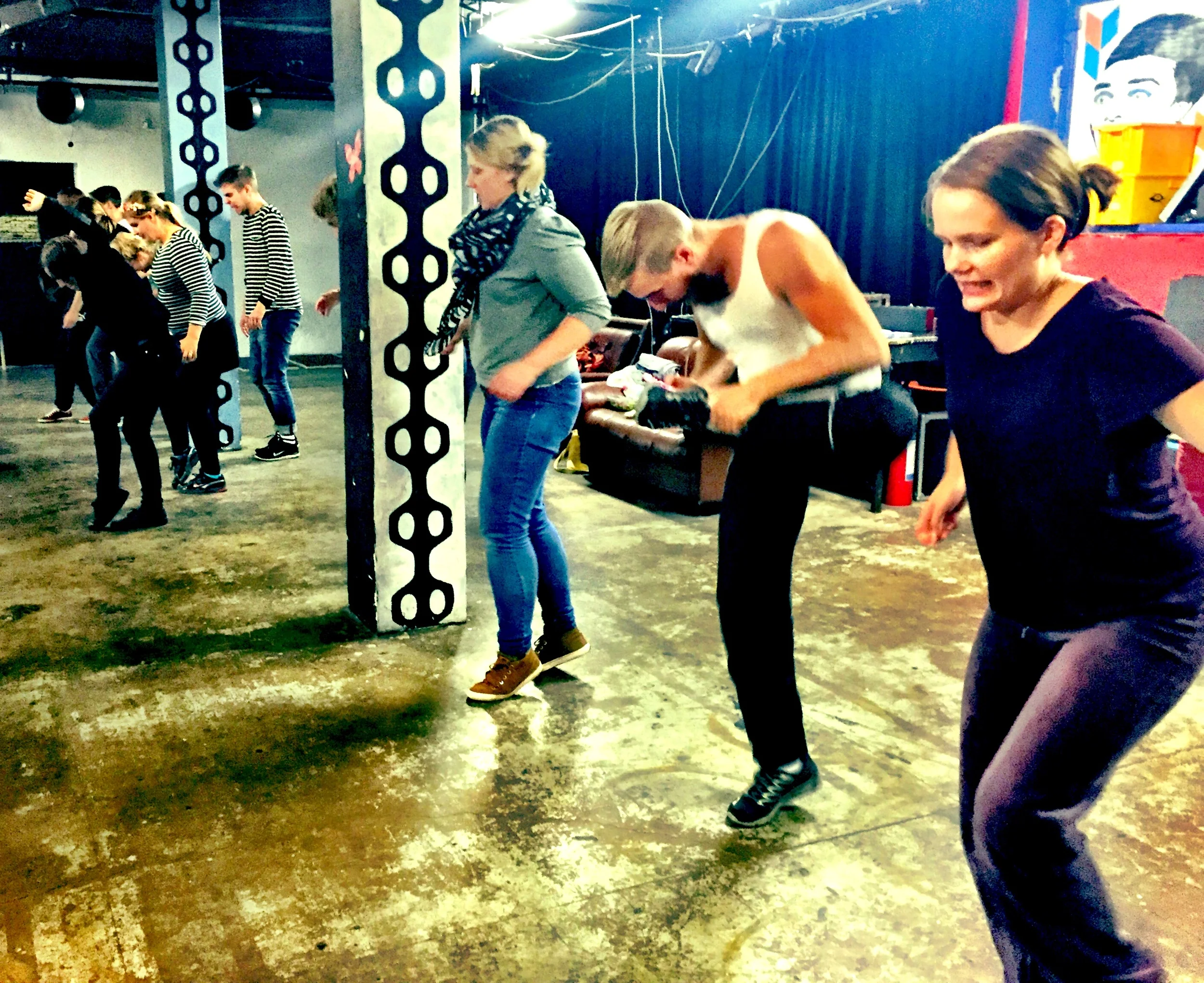 The workshop Using the Space & Moving was rat packed: with players and with things to learn. It included transportation, sports, professions, locations, doors, heights, movement, break-ins and pursuits. Some truly exciting scenes emerged. Did I mention these Finnish improvisers were a fanatic bunch? They were.